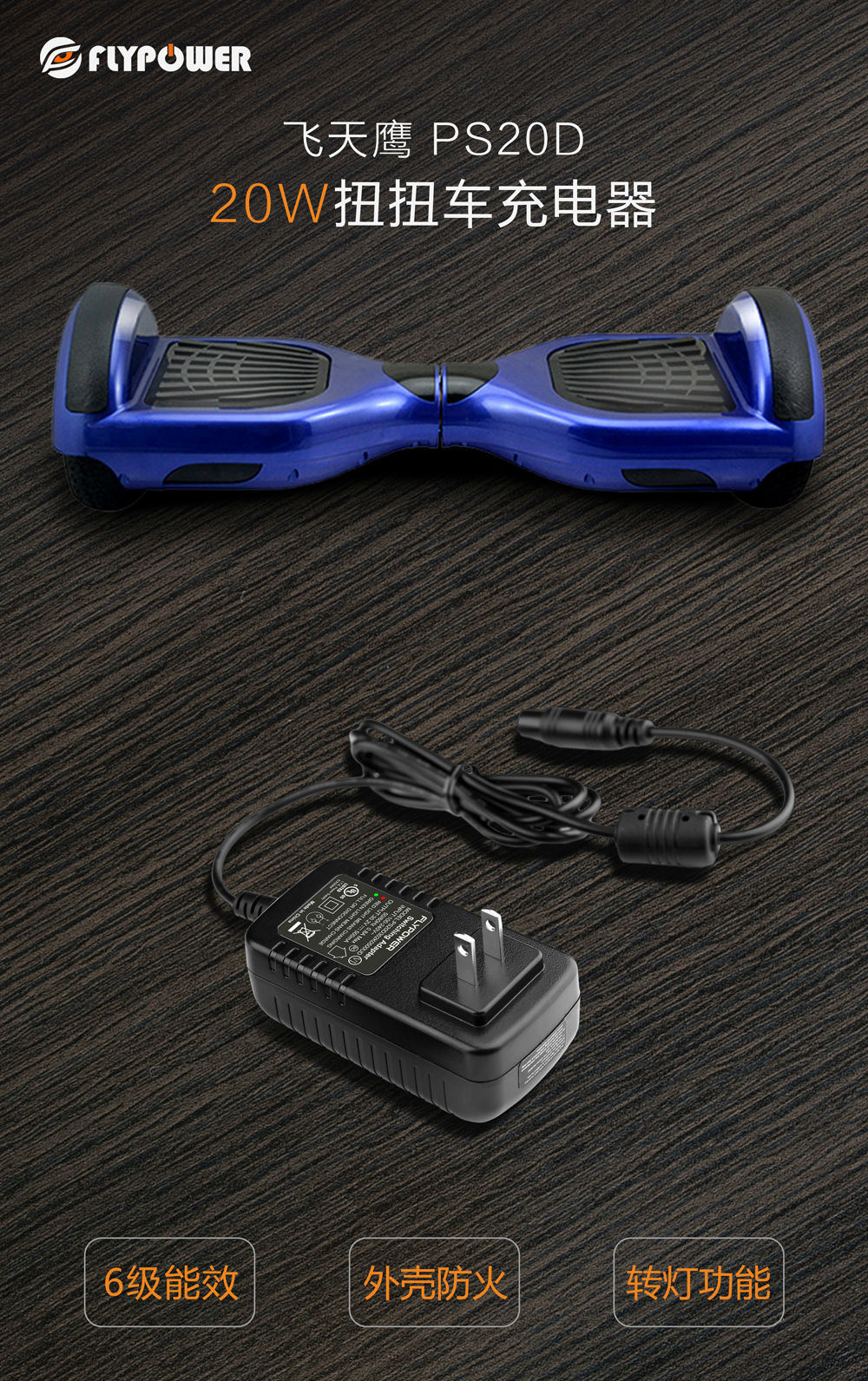 飞天鹰PS20D扭扭车充电器满足最新六级能效标准,最低待机空耗,节能又环保。