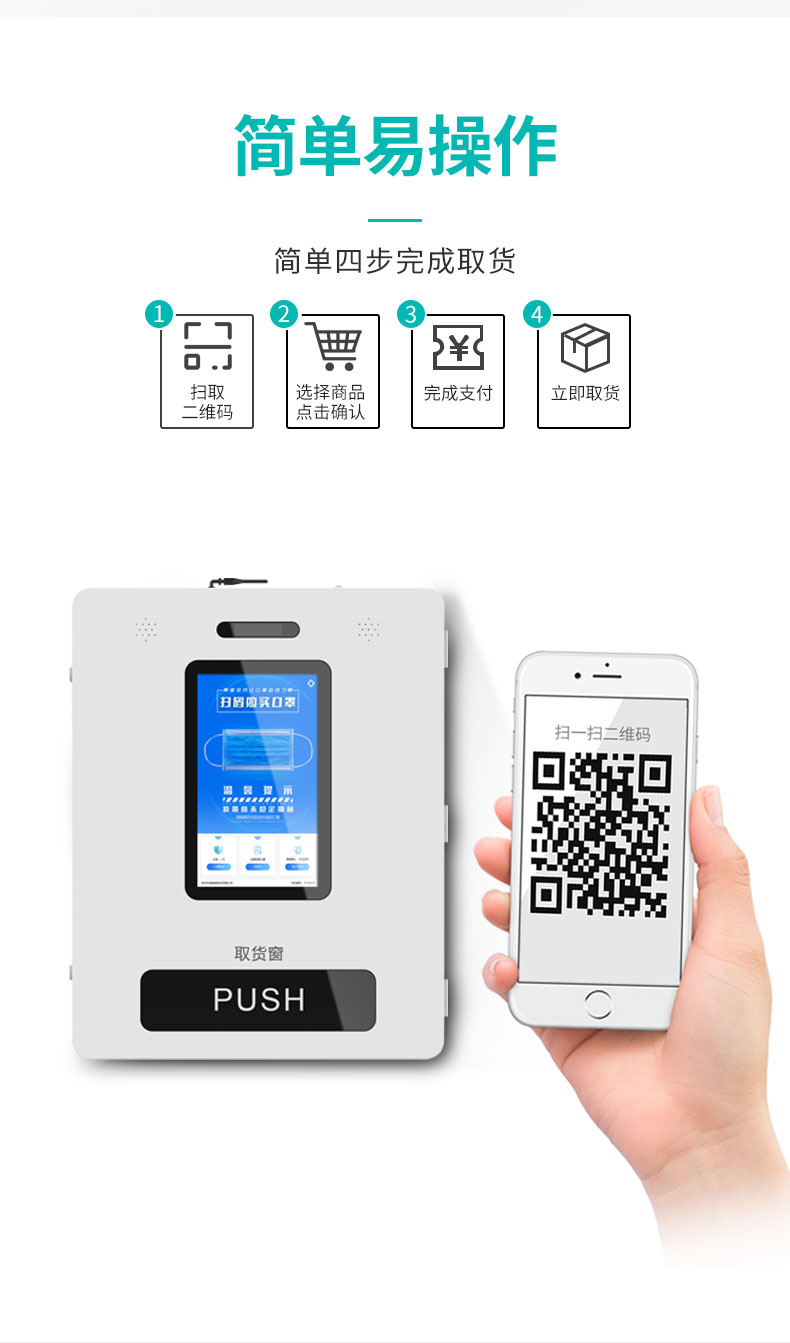使用飞天鹰口罩自动售卖机购买口罩只需简单四步:扫描二维码——选择商品——完成支付——取货,操作简单,购买方便。机器上的广告屏支持播放图片、视频,既可以做引导宣传,也可以投放广告。