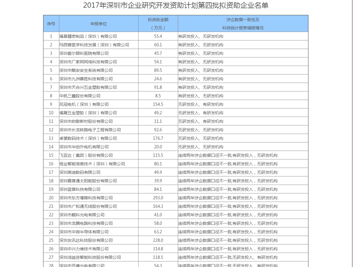 深圳市科技创新委员会关于2017年企业研究开发资助计划第四批拟资助企业的公示:为了贯彻落实市委市政府《关于促进科技创新的若干措施》(深发〔2016〕7号)精神,根据《深圳市科技研发资金管理办法》等有关规定,2017年企业研究开发资助第四批(最后一批)审核工作已经结束,拟资助企业146家,资助金额10972.2万元。深圳市飞天鹰有幸获得政府的创新研发资金的资助,感恩政府,飞天鹰会继续加大技术研发力度,为社会提供更高效,更安全的电源产品。