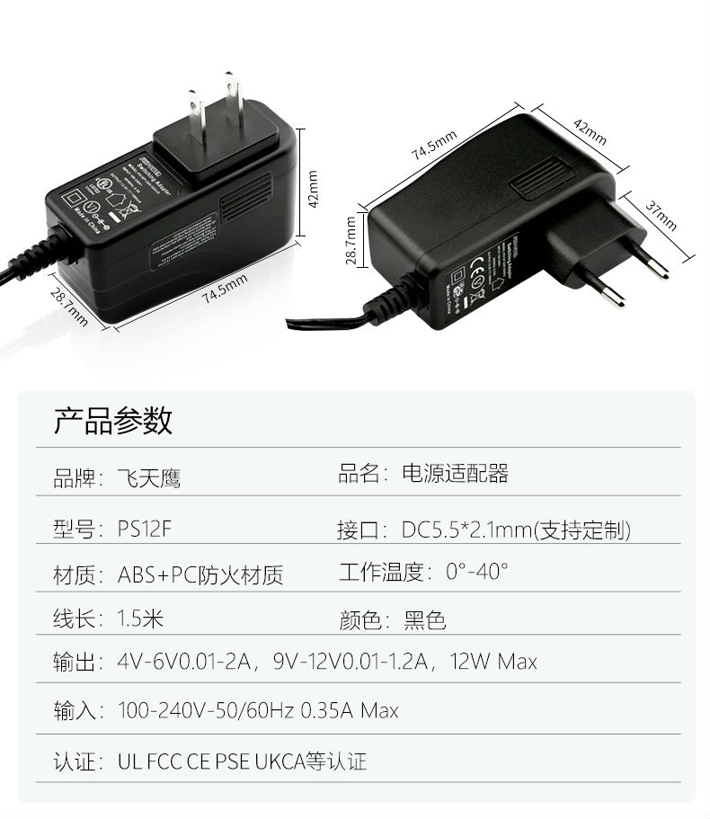 输 出:4~6V 0.01~2A/ 9~12V 0.01~1.2A 12W Max