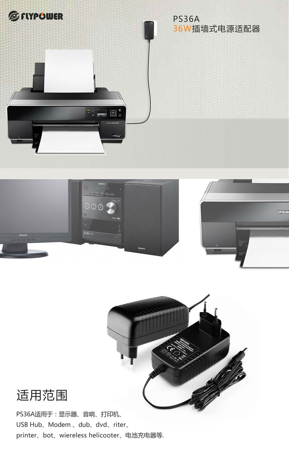 安防设备、路由器、DVB、电子词典、打印机、监控器、DVD、ROBET Wireless leilcopter、医疗仪,游戏机、数码机、投影仪、录像机、净水器、空气净化器、按摩枕、3D打印机 美容仪充电器等IT设备。